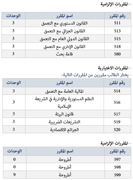 كما يوفر قسم القانون العام العديد من المقررات الدراسية المتنوعة في القانون العام لطلبة درجة الليسانس، ويقوم أعضاء هيئة التدريس في قسم القانون العام بتدريس المواد التالية: مباديء الاقتصاد 107، القانون الدستوري 121، الحقوق والحريات العامة 321، القانون الإداري(1) 221، المالية العامة 223، النظم السياسية 224، قانون البترول 271، مباديء الإدارة العامة 317، القانون الإداري (2) 322، التشريعات الضريبية 328، قضاء دستوري 423، المنظمات والظواهر الاقتصادية الحديثة 424، عقود إدارية 425، الحريات الإعلامية 428.