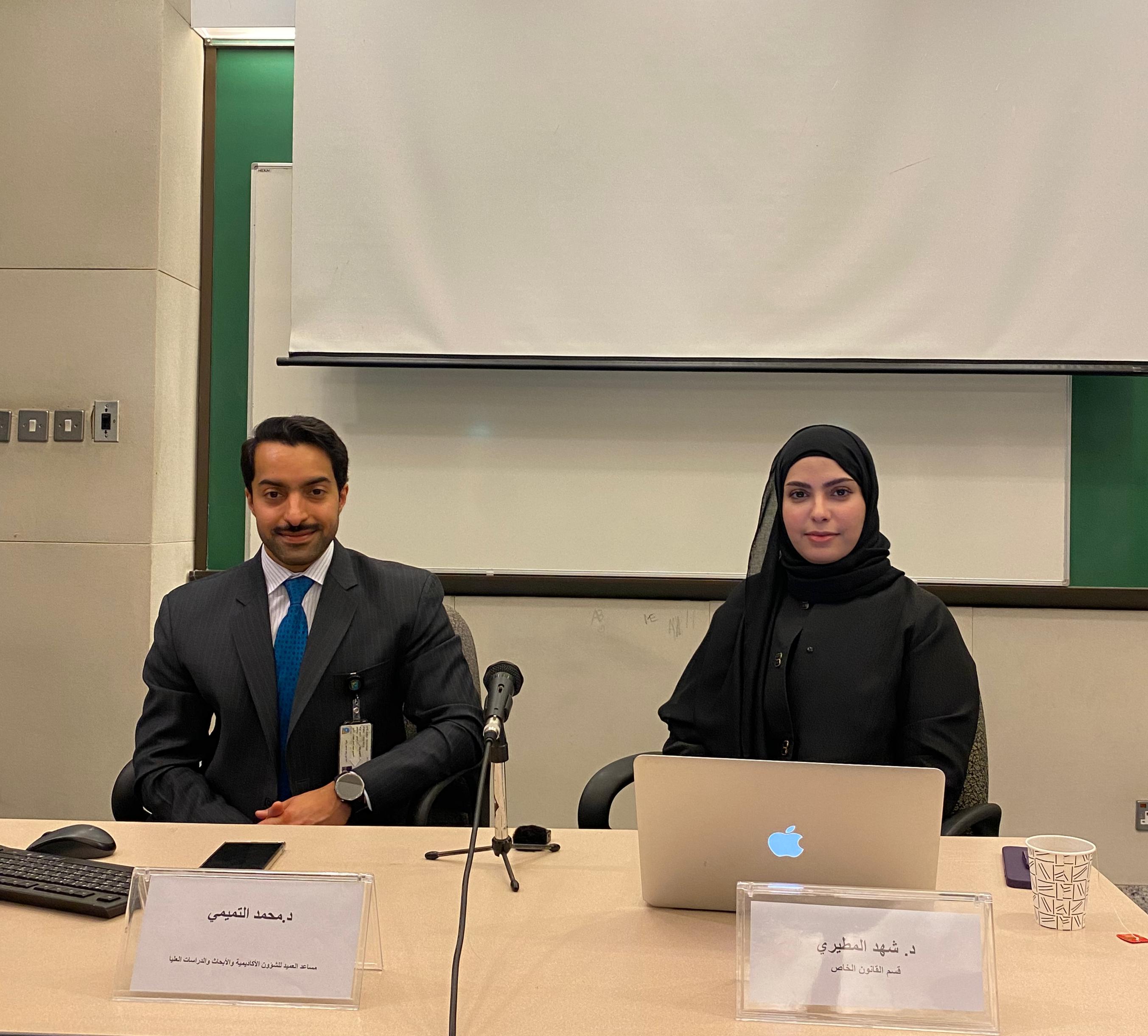 استكمل مكتب مساعد العميد للشؤون الأكاديمية والأبحاث والدراسات العليا في كلية الحقوق سلسلة الندوات التعريفية لرسائل الدكتوراه الأعضاء هيئة التدريس الجدد في الكلية، حيث استضاف مساعد العميد للشؤون الأكاديمية والأبحاث والدراسات العليا د. محمد التميمي د. شهد المطيري خريجة جامعة ليدز في المملكة المتحدة، بحضور عدد من المهتمين والأكاديميين.