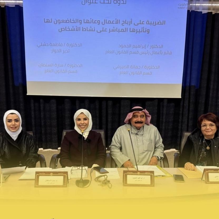 نظم قسم القانون العام بكلية الحقوق في جامعة الكويت ندوة تحت عنوان "الضريبة على أرباح الأعمال وعاؤها والخاضعون لها وتأثيرها المباشر على نشاط الأشخاص"، أدارتها الدكتورة فاطمة دشتي، وشارك فيها كل من القائم بأعمال رئيس قسم القانون العام الدكتور إبراهيم الحمود والدكتورة سارة السلطان، والدكتورة جمانة الصيرفي، بحضور عدد من أعضاء هيئة التدريس وطلبة الكلية، وذلك على مسرح عثمان عبد الملك