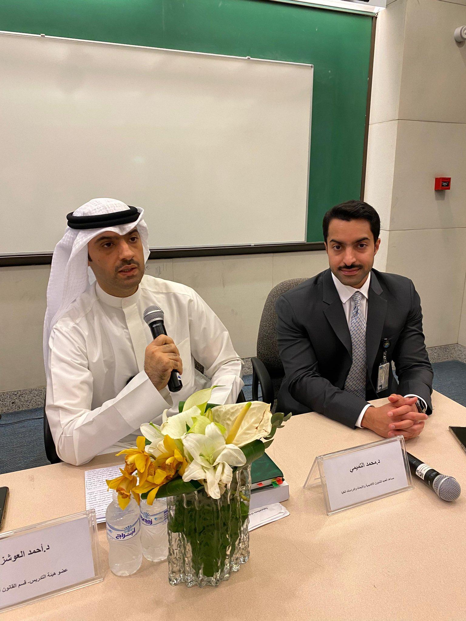 افتتح مساعد العميد للشؤون الأكاديمية والأبحاث والدراسات العليا د. محمد التميمي سلسلة البرنامج التعريفي لرسائل الدكتوراه في كلية الحقوق مع د. أحمد العوشز خريج جامعة جامعة ستراسبورغ الفرنسية، بحضور عدد من المهتمين والأكاديميين.