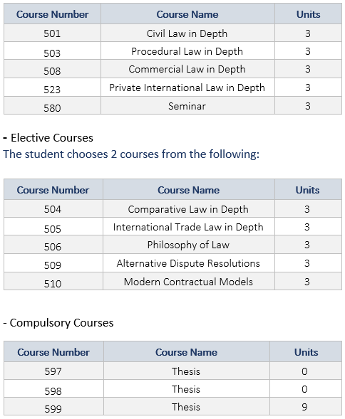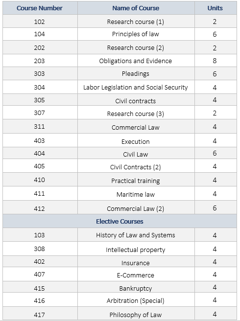 - Private law department offers: a master of private law and commercial arbitration diploma and contributes some courses in the Master of Environmental Science.