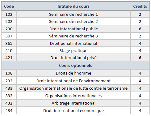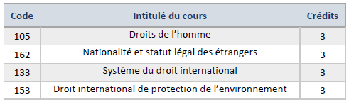 En matière d’enseignement, il propose le droit international public et certaines de ses branches, le droit international privé, l’arbitrage international, les travaux de recherche, les stages pratiques, le droit des droits de l’homme pour les non-juristes, le droit international des organisations, le droit international de l’environnement, et pour la première fois, un cours de droits de l’homme en anglais pour les non-arabophones.